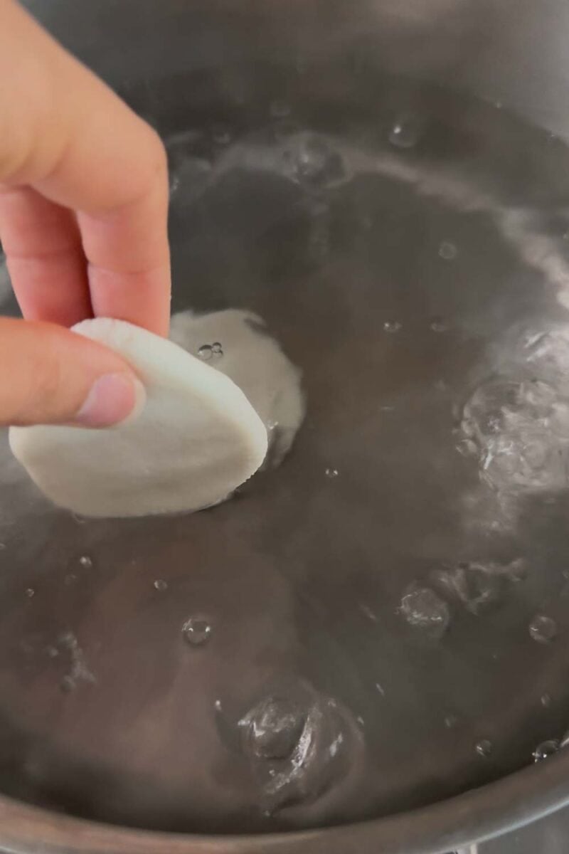 Simply drop the shaped dough into boiling water. It will sink to the bottom. No thermometer, no time, no guessing. Just watch and wait. When the rice cakes bob up to the surface, they’re ready! The water tells you everything to need to know.
