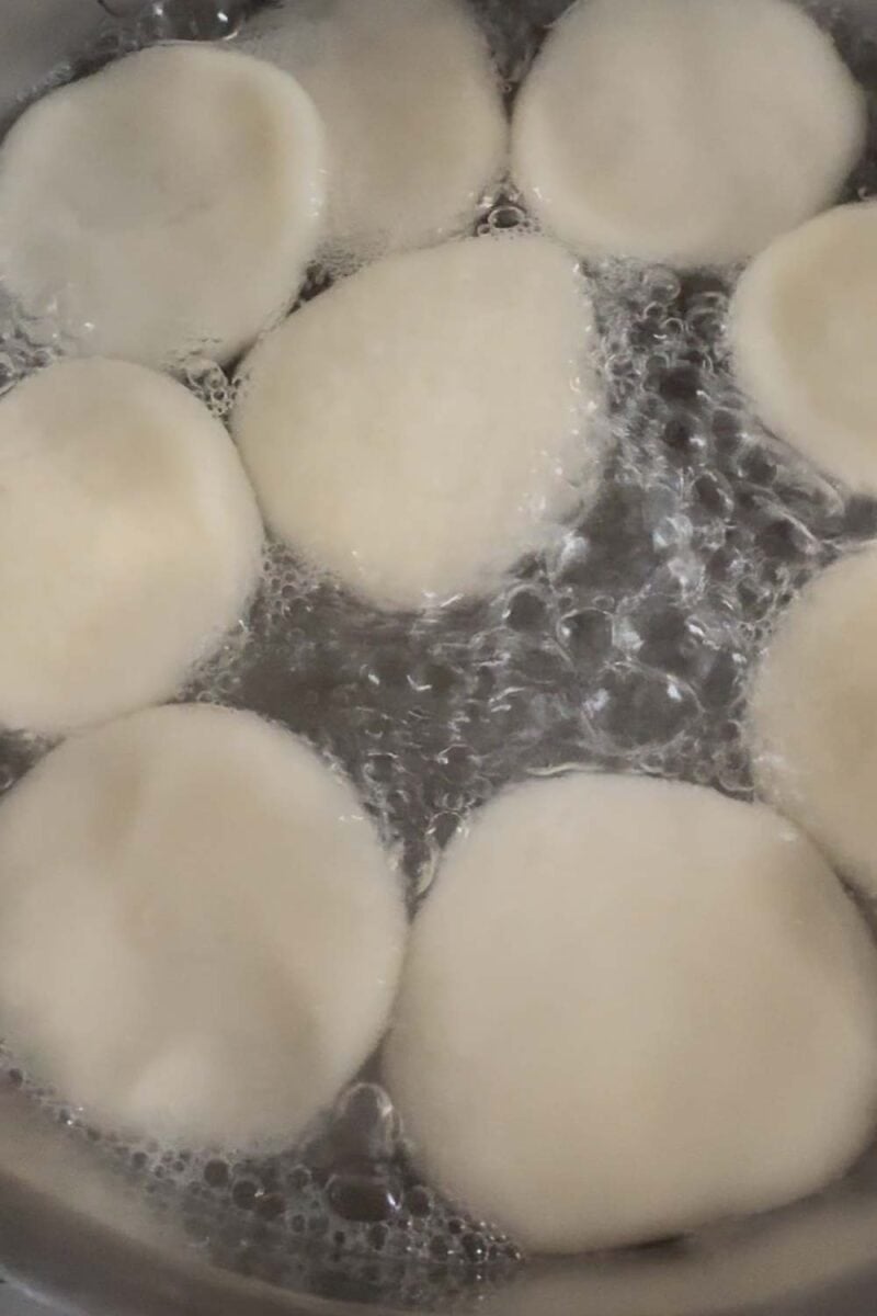 - Depending on the size of your pot, gently drop 5-10 rolled out dough rounds into the boiling water. The dough will sink to the bottom of the pot. Gently stir water to ensure dough doesn't stick to the bottom.